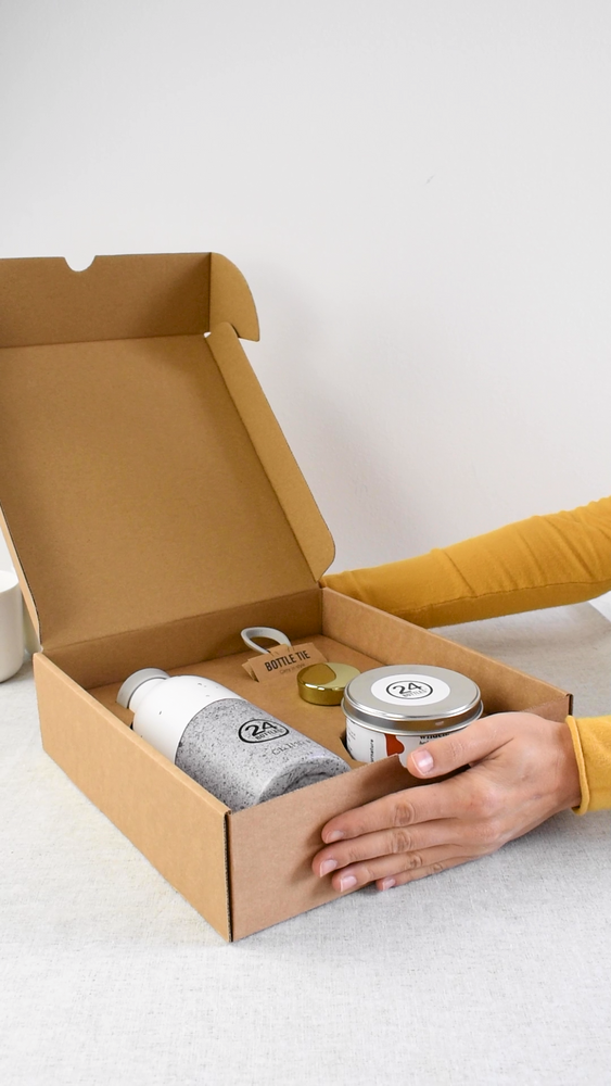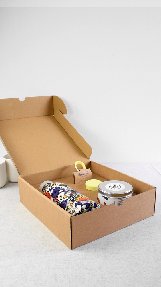 stylish box including infuser thermos bottles, organic tea, clima cap, bottle tie